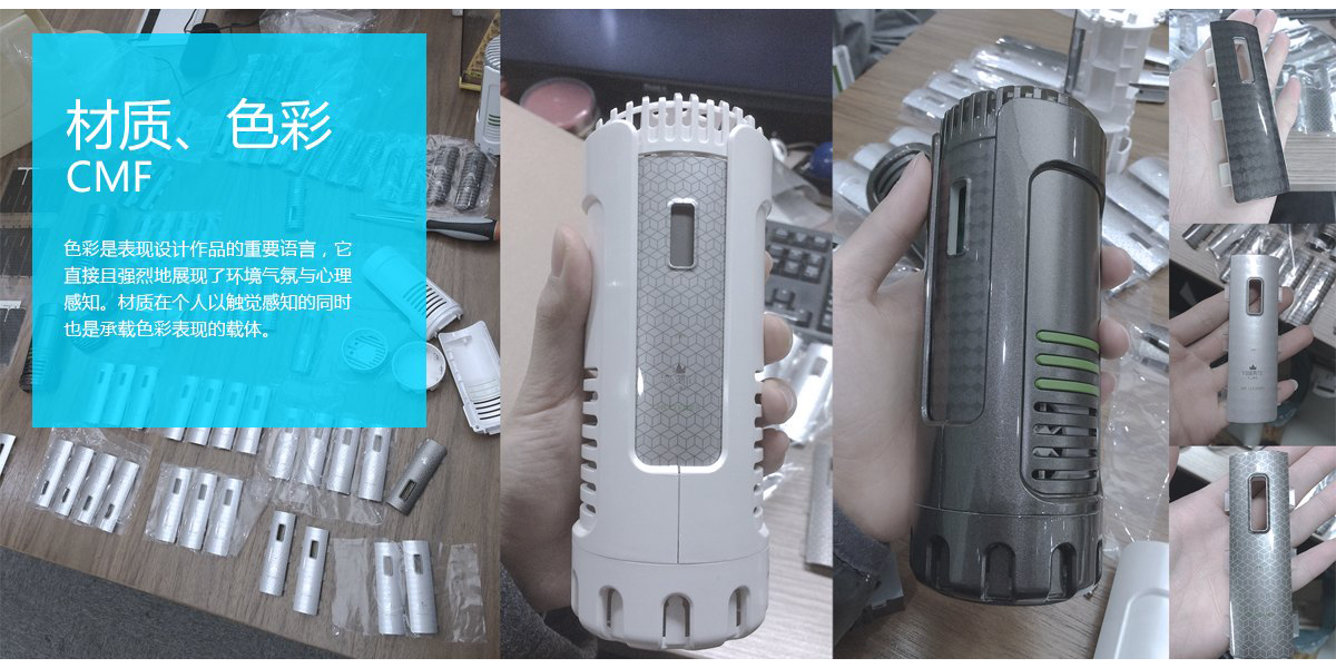 該產品小巧便攜,提升用戶在不同環境切換使用的便捷性;通過高效去除PM2.5、YVOC、病毒和異味讓車內清潔空氣源源不斷。前期通過產品使用需求與環境的分析,最終將該產品定義為車載、家用以及辦公三種產品應用場景,通過產品CMF的設計以匹配不同使用場景。