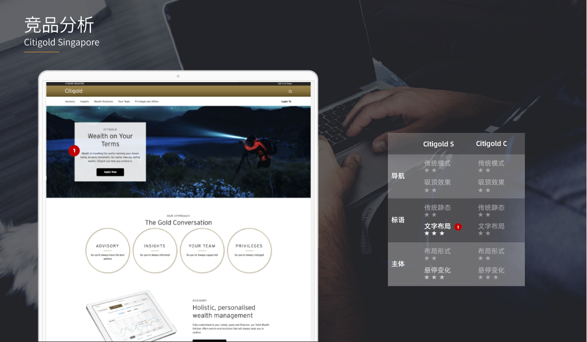 為了向Citigold用戶提供的更優質的理財服務體驗,本設計從網頁視覺與網頁交互兩個角度,問題診斷、競品分析、參考案例三個方面對其用戶界面進行了優化設計研究,最終輸出符合品牌調性的優化方案。