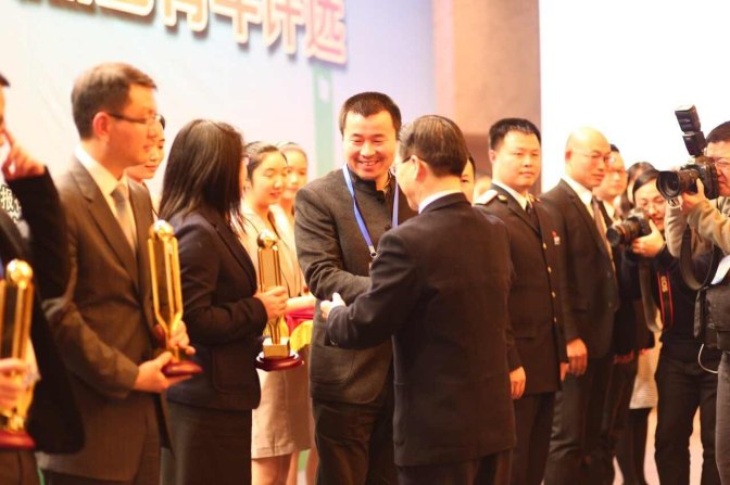 丁偉從全國政協常委、上海市政協副主席周漢民領導手中接過這意義深刻的獎杯